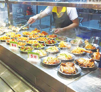 此模式采用对每道菜分别定价方式,分别为1.0元一6.0元不等,例如:青菜 1.0元、茄子1.5元、红萝肉片2.0元、辣子鸡丁3.0元、红烧福寿鱼4.0元等,所有菜品分别用碟子装好摆放保温台上,用餐人员根据自己喜欢自由选择消费。