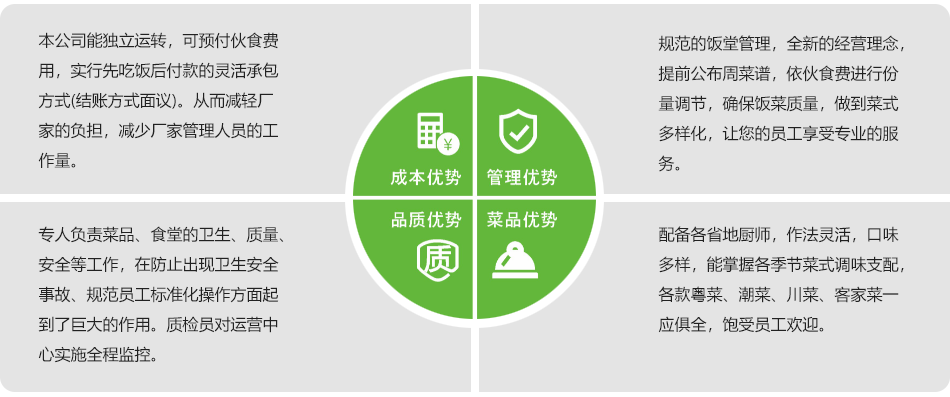贵公司提前将饭堂就餐的人数以联络单的方式或领取饭卡的方式报数给我司,我司按照报餐人数准备饭菜,月底根据联络单或饭卡数量与贵司对账,并按此与贵司结算,我司调派专业厨务团队人员进行专业厨房操作及管理,为贵公司提供色香味美的膳食服务。